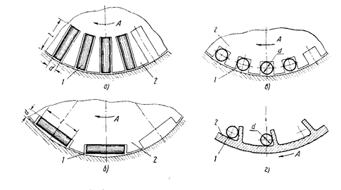 Схемы карманчикового захватного органа: а — при радиальном: б — хордальном: в и г — аксиальном расположении