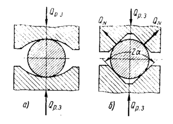 Разновидности клиновых захватных органов: а – роликовый; б – шариковый; в- цанговый; г - эксцентриковый; А - направление движение материала; Б - движение подвижной каретке; В- заготовка.