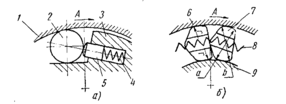 Кривошипно -рычажные механизмы (в и г) состоят из кривошипа 1, регулируемой тяги 5, двуплечего рычага б и ползушки 8. Так как механизм, показанный на рис. в, обеспечивает передачу движения в двух взаимно перпендикулярных плоскостях, то тяга 5 снабжена еще шарнирными муфтами. Кроме того, привод ползушки 8 осуществляется через тягу 9, дополнительный рычаг 10, соединенный с ползушкой 8. в механизме на рис. г ползушка 8 с тягой 5 соединяется аналогично показанному на рис. б.