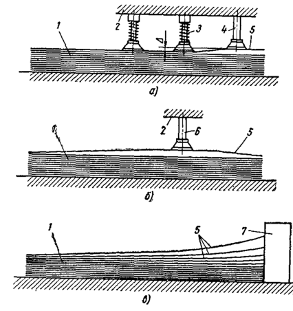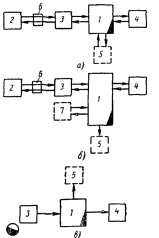 1 — технологический агрегат; 2 — ориентирующе-питающее устройство; 3 — подающее устройство; 4 — устройство для удаления отработанного материала; 5 — устройство для удаления готовых изделий (штучных); 6 — контрольное устройство; 7 — передающее устройство (для штучных деталей).