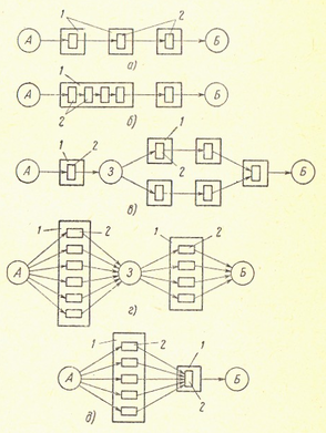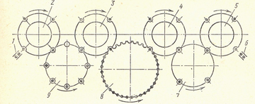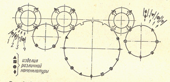 Схема роторной линии, где рабочие роторы 7,8,9, имеют различное число позиций; заготовка из магазина-накопителя 1 проходит через транспортные роторы 2, 3, 4 и 5 и обрабатывается в рабочих роторах 7, 8 и 9, имеющих различное число позиций, и поступает в приемный магазин 6.