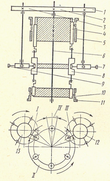 схема работы роторной машины системы Кошкина. Заготовка в зоне I подается в рабочий ротор, закрепленный на валу 6, транспортным питающим ротором 13 при его непрерывном вращении, В зоне I при вращении рабочего ротора заготовка обрабатывается, и в зоне III деталь снимается транспортным ротором 12 посредством несущих органов 7. Несущие органы 7 и 9 приводятся во вращение зубчатыми колесами 3, 2, 1.В зоне IУ происходит смена инструмента. Инструменты крепятся в блоках 8, которые при вращении ротора перемещаются ползунами 4 и 10 под воздействием неподвижных копиров 5 и 11.