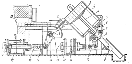 При включении пневматического цилиндра 11 дно кассеты приподнимается, выдвигая последовательно по одному ряду заготовок, которые под действием силы тяжести попадают в приемник 1. Нижняя заготовка, находящаяся в приемнике, двигаясь по дуге, заталкивается шибером 13 в печь 18. При этом заготовки, находящиеся в печи, перемещаются на шаг, а крайняя (нагретая до не обходимой температуры) сталкивается на питающее устройство, транспортирующее ее к штамповочному агрегату.