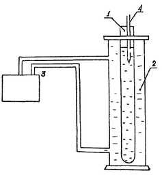 Рис. 1. Схема установки измерения вязкости методом Стокса: 1 – стеклянная труба, заполненная глицерином, 2 - резервуар с водой, 3 - термостат,
