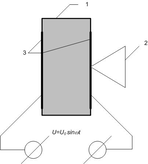 Подробнее остановимся на конструкции источника и приёмника. Источник и приёмник звуковой волны одинаковы по конструкции и параметрам (см. рис. 2). Они представляют собой цилиндрические пластинки 1 из сегнетоэлектрического материала с укрепленным на излучающей (приемной) поверхности небольшим диффузором 2. На торцевые поверхности пластинок нанесены серебряные электроды 3. Если к электродам подведено переменное напряжение, то в сегнетоэлектрике 1 возникают упругие механические колебания с частотой подведенного напряжения и с амплитудой, пропорциональной амплитуде напряжения. Эти механические колебания передаются на диффузор и создают в окружающем пространстве звуковые волны. И наоборот, если подобная пластина испытывает механические воздействия (в частности, воздействие волны звукового давления), то на ее обкладках возникает электрическое напряжение той же частоты с амплитудой, пропорциональной амплитуде звукового давления. Сегнетоэлектрические излучатели (приемники) обладают высокой чувствительностью в рабочей полосе частот, расположенной вблизи частоты механического резонанса пластины. В нашем случае резонансная частота равна примерно 40 кГц.