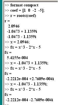 Текст этой же программы, составленной по алгоритму, используемому в лабораторной работе по MathCAD (раздел 1.9.4.), приведен на рисунке ниже. Рядом с этим рисунком справа приведен рисунок с фрагментами записей в командной строке MATLAB, иллюстрирующими расчет корней полинома с помощью функции roots и с результатами подстановки значений корней в уравнение fx = x3 -2x -5 . Функция roots позволяет не только быстро найти корни полинома, но и определить их, если они еще и комплексные: