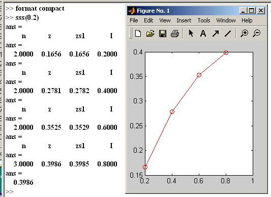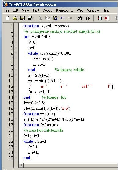 Пример расчета суммы членов разложения в ряд функции sin(x) и расчета выражения sin(x)/(1+x) для 5 значений х с точностью 0.001. Программа выводит график указанного выражения в рассчитываемом диапазоне изменения переменной x. Кроме того, приводятся строки результатов расчета для каждого значения х : число суммируемых членов разложения (n); значение выражения, рассчитанное с использованием суммы членов разложения; значение выражения с применением (для сравнения) внутренней тригонометрической MATLAB - функции sin(x); значение переменной х.