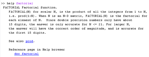 Комментарии начинаются со знака %. Они автоматически окрашиваются в зеленый цвет. Первый комментарий после заголовка называется “ Строкой H1 (H1 line)”. MATLAB выводит эту строку в командное окно после вызова справки функцией lookfor или после запроса помощи по папке, в которую входит М-файл. Matlab ищет указанное в команде слово в строках H1-line всех файл-функций в каталогах, указанных в путях поиска, в том числе и в текущем каталоге. Так, если например, задать в командной строке >> lookfor factorial, то MATLAB найдет не только ссылку на функцию factorial, но и на все функции, в H1 line которых содержится слово factorial :