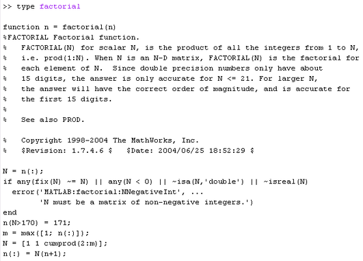 Все встроенные функции MATLAB оформлены именно в таком стиле, поэтому при создании набора функций, предназначенных для широкого круга пользователей, есть смысл придерживаться данных соглашений. Например, собственная функция по расчету факториала fact может иметь следующее содержание: