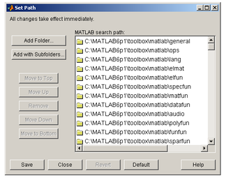 Для добавления каталога используется кнопку Add Folder… и в появившемся диалоговом окне Browse for Folder указывается требуемый каталог. Добавление каталога со всеми его подкаталогами осуществляется при нажатии на кнопку Add with Subfolders. Путь к добавленному каталогу появляется в списке MATLAB Search Path. Порядок поиска соответствует расположению путей в нем — первым просматривается каталог, путь к которому размещен вверху списка. Порядок поиска можно изменить, или вообще удалить путь к какому-либо каталогу. Для этого требуемый каталог выделяется в списке и его положение определяется при помощи следующих кнопок: