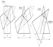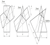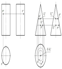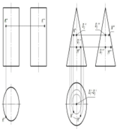 | 29. Прямоугольная изометрия. Точные и привязанные коэффициенты искажения. Если все три показателя равны (k=m=n), то проекция называется прямоугольной изометрической. основная формула: k2+m2+n2=2 Точные – 0,82;0,82;0,82, Привязанные(без искажения по всем осям) – 1;1;1. (x,y,z) 30. Прямоугольная диметрия. Точные и привязанные коэффициенты искажения. Если два показателя искажения равны (например, k=n), а третий отличен от них (k=2m=n), то проекция называется прямоугольной диметрической. основная формула: k2+m2+n2=2 Точные – 0,94; 0,47; 0,94, Привязанные (без искажения по x,z)– 1;0,5;1. (x,y,z) | 31. Алгоритм построения касательной плоскости к поверхности в данной точке. Что называется нормалью поверхности в данной точке? Для задания касательной плоскости в точке К нужно провести через эту точку 2 линии на поверхности (желательно простые) и построить к каждой из них касательную. Нормалью к поверхности в заданной точке наз. прямая, перпендикулярная к касательной плоскости и проходящая через точку касания. | 32. Что называется разверткой поверхности? Какие бывают развертки? Разверткой называется фигура, полученная от совмещения поверхности с плоскостью. Развертки поверхностей бывают точные (развертки многогранников), приближенные (развертки цилиндрической и конической поверхностей) и условные (для всех неразвертываемых поверхностей). Практически развертки развертываемых поверхностей получают, заменяя поверхности гранными фигурами: для цилиндрической поверхности делают развертку вписанной (или описанной) в поверхность призмы; для конической - пирамиды. При этом получают приближенные развертки с необходимой точностью, увеличивая число граней призмы или пирамиды. |
