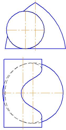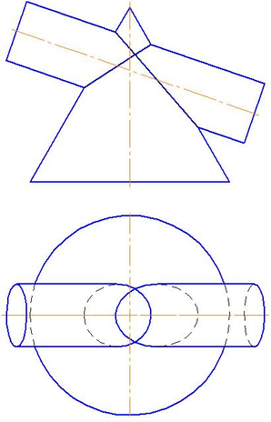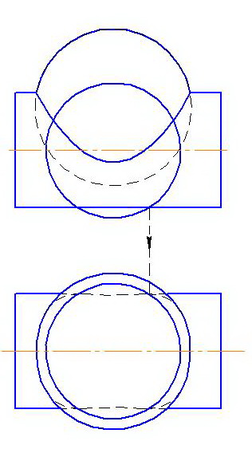 Решение основано на проведении горизонтальных линий на виде спереди через оба тела и построении окружностей с заданным радиусом на виде сверху, которые при пересечении будут давать точки ,принадлежащие линии пересечения поверхностей.