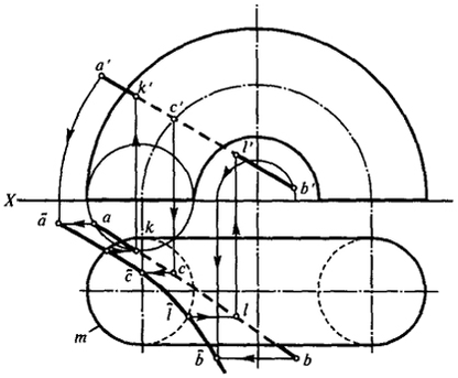 Аналогично поступаем и с точками явного пересечения тора прямой на виде спереди. Их поворот относительно центра тора совпадет с контурной окружностью тора и краем тора (на рисунке сверху это точки b и с). Получаем гиперболу (не прямую ,как на вашем рисунке). Теперь точки пересечения гиперболы с окружностью основания тора (точка К и L) проецируются но прямую а’. Далее просто проецируем их на вид спереди, получаем точки пересечения прямой с тором.На рисунке выше тоже есть ошибка. На виде спереди штриховой линией зарисовывается прямая а от точки L и до конца тора ,а не до точки К. На виде сверху все правильно.