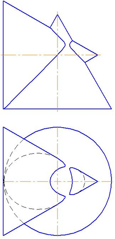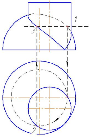 ля начала проецируем очевидные точки пересечения усеченного конуса с тором (1 и 2) на виде спереди. На виде сверху они лежат на горизонтальной оси симметрии конуса.