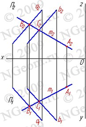 Как на чертеже найти недостающую проекцию точки, принадлежащей поверхности? Дано: плоскость T(а,в) и проекция точки А2. Требуется построить проекцию А1 если известно, что точка А лежит в плоскости в,а. Через точку А2 проведем проекцию прямой m2, пересекающую проекции прямых a2 и b2 в точках С2 и В2. Построив проекции точек С1 и В1, определяющие положение m1, находим горизонтальную проекцию точки А. | 19) – рисунок | -
