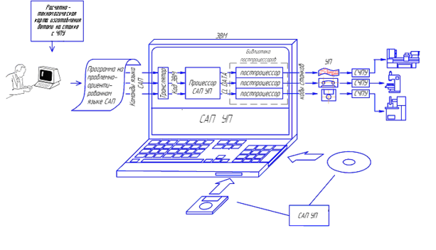 Постпроцессор – комплект программ для перевода информации с машинного языка на язык конкретного станка с ЧПУ.