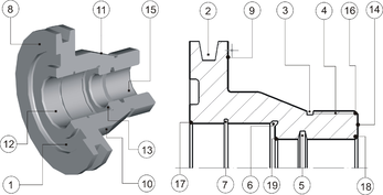 К основным зонам относят зоны наружных и внутренних поверхностей с радиусами и криволинейными образующими, обрабатываемые проходными и расточными резцами с главным углом в плане =95 и вспомогательным углом в плане ’=30; зоны торцевых поверхностей; зоны неглубоких канавок (до 1.5 мм), например, канавок для выхода шлифовального круга. На рисунке 6.1а основные зоны с 8-19 указаны толстыми линиями.
