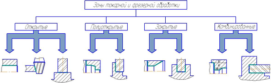 В зависимости от конфигурации участка чернового или чистового контура детали зоны обработки также делятся на открытые, полуоткрытые, закрытые и комбинированные (рис.6.3).