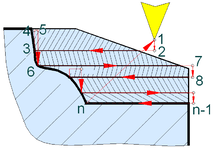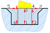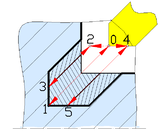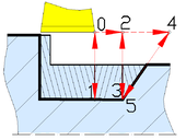 1) Начальная точка врезания обычно отстоит на 1-2мм от внешней границы припуска, конечная точка совпадает с начальной точкой инструментального перехода.