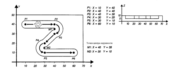 Рис.7.31 Пример задания опорных точек эквидистанты Р1-Р6 в декартовой системе