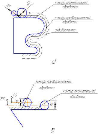 для чистовой и черновой обработок при применении разных диаметров фрез (рис.7.36 а) и смещением исходной точки программы (рис.7.36 б).