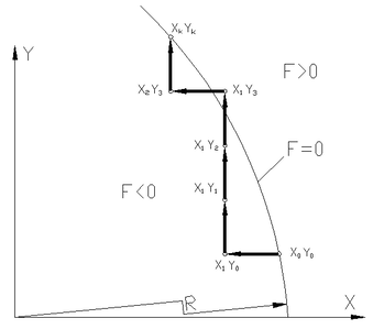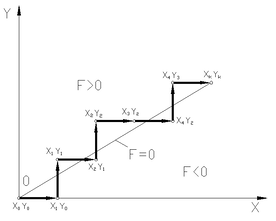 Если промежуточная точка траектории интерполяции (например точка с координатами x1, y3) находится в области F>0, то следующий шаг делается по оси X. Если промежуточная точка траектории интерполяции (например, точка с координатами x2, y3) находится в области F<0, то следующий шаг делается по оси Y.