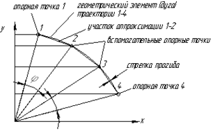 Аппроксимация – процесс замены одной функциональной зависимости другой с определённой степенью точности (рис. 8.1). Процесс аппроксимации нужен для того, чтобы станок мог обработать криволинейные участки перемещением рабочих органов по соответствующим координатам (x, y, z). В процессе аппроксимации геометрический элемент траектории (см. раздел 7.2.1), ограниченный опорными точками, разбивается на элементарные участки, называемые участками аппроксимации. Участок аппроксимации дуг окружностей удобно выражать величиной угла . Точки, разграничивающие участки аппроксимации, называются промежуточными опорными точками. Точность аппроксимации тем выше, чем меньше длина участков аппроксимации. Величина участков рассчитывается исходя из заданной величины точности аппроксимации. Точность аппроксимации определяется стрелкой прогиба –максимальным отклонением аппроксимирующей линии от аппроксимируемой поверхности. (см. рис. 8.1).