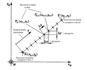 В виду того, что информация о перемещении по координатам выдается дискретно, действительная траектория перемещения будет представлять собой ступенчатую форму. Величина погрешности интерполяции зависит от соотношения величин перемещения по координатным осям, т.е. от длины и угла наклона отрезка прямой.