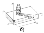 а) линейная интерполяция методом оценочной функции; б) движение инструмента при фрезеровании по управляемым координатам X,Y,Z; в) движение инструмента при точении по управляемым координатам X,Z.