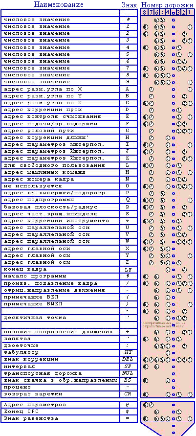 На рис.8.5 приведены символы и их кодовые комбинации при вводе УП с перфоленты. На рисунке в отверстии указан номер пробиваемой дорожки.