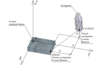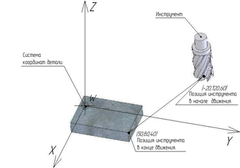 Команды G90 X50 Y80 Z40 в данном примере переместят инструмент в точку вышеуказанной позиции, независимо от того, какую позицию занимает инструмент в предыдущем кадре.