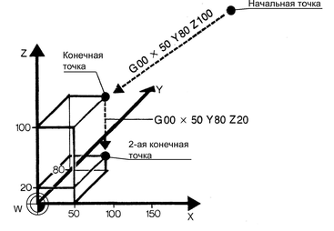 | G00 X50 Y80 Z20 | - последующее быстрое позиционирование к точке с координатами X=50; Y=80; Z=100. |