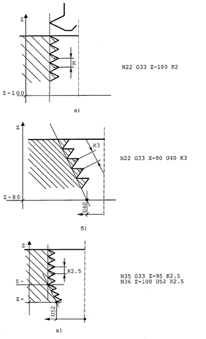 G33 является модальной функцией. Примеры нарезания резьбы с постоянным шагом приведены на рис. 9.17: цилиндрическое нарезание резьбы (рис.9.17 а), коническое нарезание резьбы (рис.9.17 б), цилиндрически-коническое нарезание резьбы (рис.9.17 в). Система ЧПУ будет управлять нарезанием конической резьбы, если в формате заданы 2 координатные оси, например, Z,V (см. рис.9.17 б), где U- диаметральная ось.