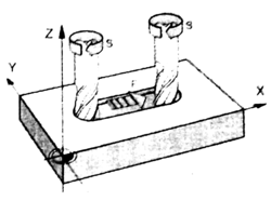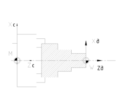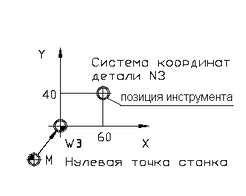 Начало системы координат станка (нулевая точка станка М) задаётся производителем станка с ЧПУ. Система ЧПУ распознаёт нулевую точку в процессе обнуления осей координат станка. Пользователь станка с ЧПУ может изменить нулевую точку станка по своему усмотрению, т.е. задать относительную нулевую точку системы координат станка. Расстояние от относительной нулевой точки станка до нуля станка М, рассчитанное в системе координат станка задаётся при помощи функции G53.