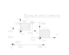 б) позиция инструмента в системе координат W1 (G54) и в системе координат W2 (G55).