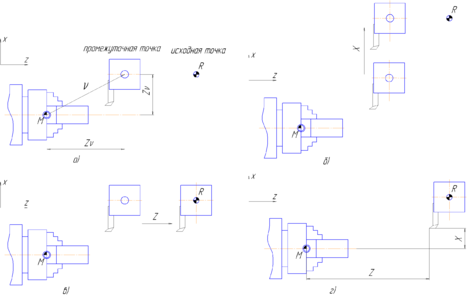 Исходные точки имеют координаты в системе координат станка, установленные предварительно в параметрах станка. Они являются, как правило, определёнными позициями, связанными, например, со сменой инструмента, сменой столов – спутников. Положение исходной точки программируется по функции G28.