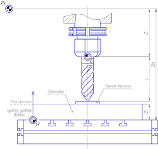 10.2.4.2. Определение положения нуля детали W и исходной точки программы Ps по оси Z на станке (рис. 10.21.).