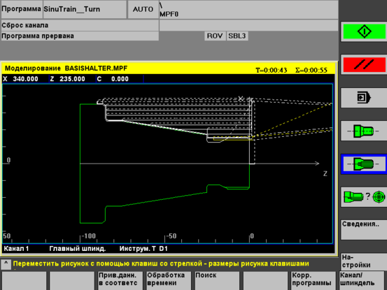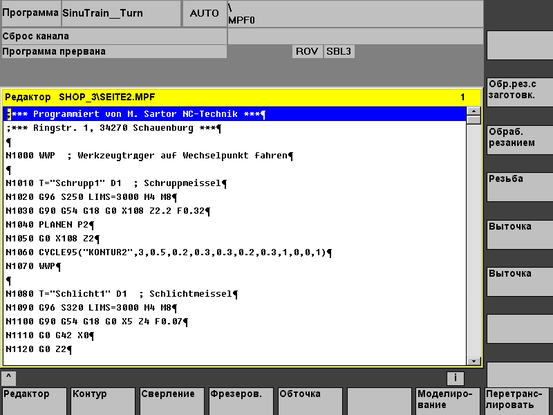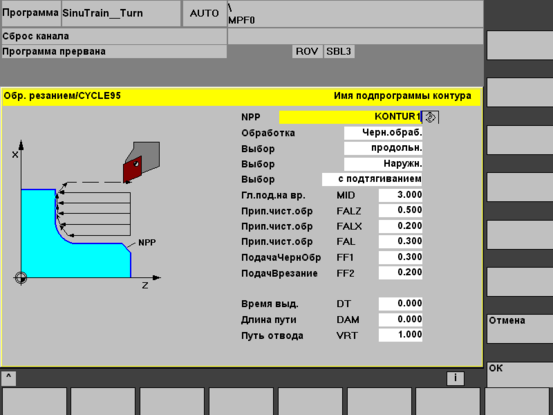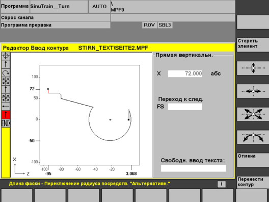 Оператор в процессе программирования выбирает требуемый по чертежу вариант из “меню” и вводит с пульта УЧПУ необходимые данные в предлагаемой последовательности. Введённые данные (графики, буквенно-цифровая информация) тут же высвечиваются на экране дисплея и, при необходимости, редактируются.