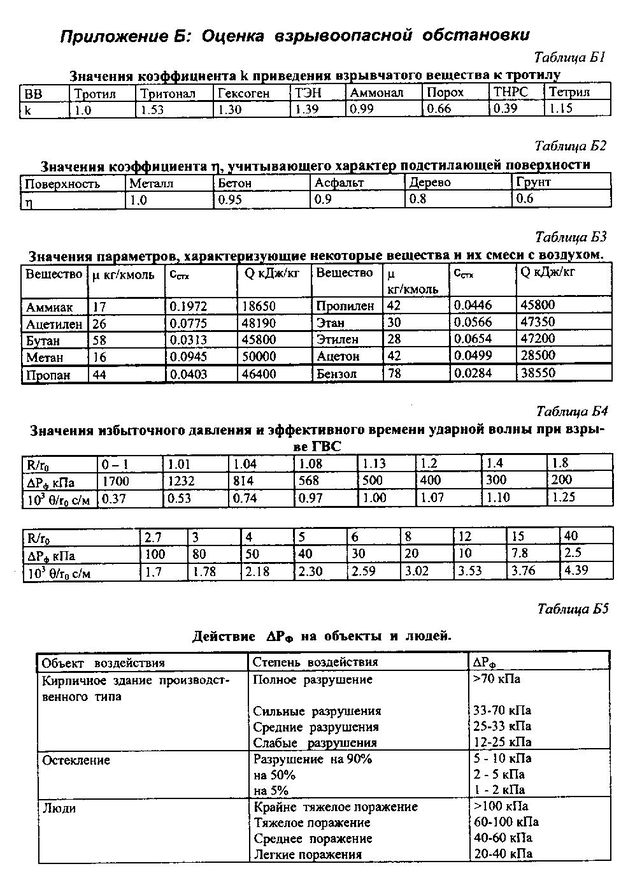 В таблице Б5 в качестве примера приведены данные только для одного типа здания. В справочной литературе имеются аналогичные сведения для большого числа различных зданий и сооружений. В таблице Б5 также приведены данные, позволяющие оценить степень поражения людей действием давления ударной волны.