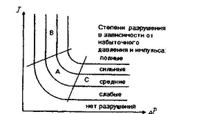 Как следует из диаграммы, лишь небольшая зона А характеризуется зависимостью степени разрушений как от давления, так и от импульса. Остальная часть плоскости соответствует прямым ∆P=const (зона В), где влияние импульса мало, и прямым I=const (зона С), где не ощущается влияния давления.