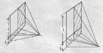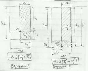В варианте г реальная ОБЩАЯ ПОВЕРХНОСТЬ ВСЕГО ФАКЕЛА пла-мени, характеризуемая ПОЛНЫМ коэффициентом облученности , для удобства расчета формируется в КАЖДОЙ симметричной стороне пламени (правой и левой относительно середины факела) из ДВУХ условных прямоугольников 1 и 2, для каждого из которых могут быть определены УСЛОВНЫЕ ЧАСТНЫЕ коэффициенты облученности ’1 и ’2. В этом случае формируемый условный прямоугольник 1 включает в себя другой сформированный условный прямоугольник 2, в котором фактического горение не происходит ,т.е. НЕТ реального факела пламени.