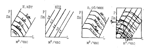 На аэродинамической характеристике находят точку с координатами L и Р, расcчитанными для данной вентиляционной системы, и по этой точке выбирают значения N, КПД и n.