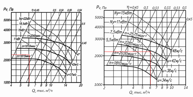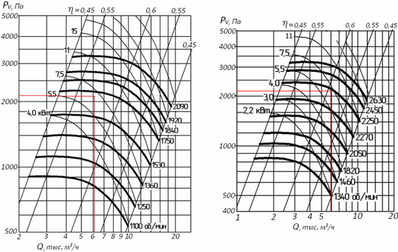 Расчёт вентиляционной установки показал общие потери давления в системе Рv =2200 Па при требуемом расходе воздуха Q= L=6000 м³/час. Подобрать вентилятор, способный преодолеть это сопротивление сети и обеспечить необходимую производительность.