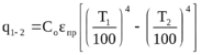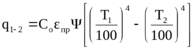 В результате для случая тел, представленных в виде бесконечных плоскостей, получим уравнение лучистого теплообмена в бесконечной плоской стенке для удельной энергии, передаваемой от первого тела второму в единицах плотности q1-2 (Т1 > Т2), :