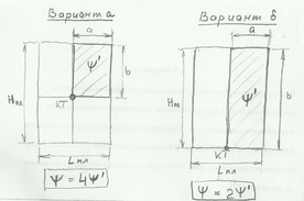 В варианте г реальная ОБЩАЯ ПОВЕРХНОСТЬ ВСЕГО ФАКЕЛА пла-мени, характеризуемая ПОЛНЫМ коэффициентом облученности , для удобства расчета формируется в КАЖДОЙ симметричной стороне пламени (правой и левой относительно середины факела) из ДВУХ условных прямоугольников 1 и 2, для каждого из которых могут быть определены УСЛОВНЫЕ ЧАСТНЫЕ коэффициенты облученности ’1 и ’2. В этом случае формируемый условный прямоугольник 1 включает в себя другой сформированный условный прямоугольник 2, в котором фактического горение не происходит ,т.е. НЕТ реального факела пламени.