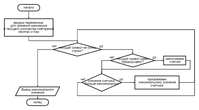 Результатом работы программы, является вывод числа, характеризующего максимальное количество стоящих подряд одинаковых символов.