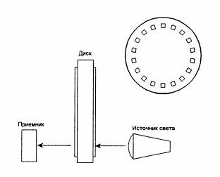 а) Вращающийся датчик положения. Крепится на валу двигателя и позволяет определять его угловое положения. Этот датчик состоит из источника света, оптического датчика (приемника) и диска с маленькими радиальными прорезями (растрами). Растровый диск укреплен на валу, источник света и оптический датчик находятся с разных сторон от диска. Когда диск вращается, то лучи проходят сквозь его прорези и падают на оптический датчик. Оптический датчик работает как переключатель, который включается или выключается при попадании на него лучей света. Это дает возможность определить относительное или абсолютное положение и направление вращения двигателя.