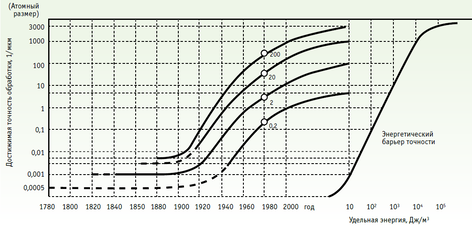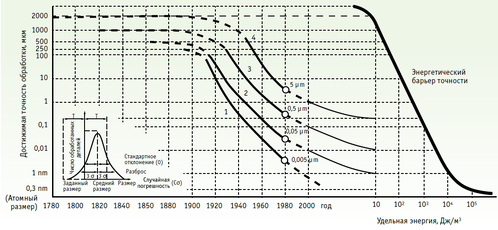 В отличие от схемы N. Taniguchi, где было упомянуто три вида обработки − традиционная, прецизионная, ультраприцизионная – на рис. 4 появилась дополнительная кривая между традиционной и прецизионной обработкой, что, по всей видимости, обусловлено необходимостью проиллюстрировать более строгое соблюдение пропорций расположения кривых с кратностью 10 (5 – 0,5 – 0,05 – 0,005 мкм). Это привело к дифференциации наименований и к появлению дополнительного вида высокопрецизионной обработки. В этом усматривается определенный смысл, так как все виды механической обработки лежат выше кривой высокопрецизионной обработки после 1980 года с потенциально достигаемой точностью не более 0,01 мкм (10 нм).