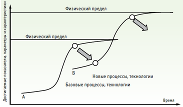 Для более полного и всестороннего рассмотрения эволюции наших представлений о точности, рассмотрим ее на протяжении обозримой истории в контексте эволюции развития техники (рис. 6) и технологических укладов (рис. 7), согласно циклам Н.Д. Кондратьева. Развитие технического объекта по известной и широко распространенной схеме, так называемой S-образной кривой (рис. 6), происходит до уровня предельных возможностей развития для физического принципа действия, который реализует рассматриваемый технический объект. В настоящее время считается, что мировая экономика в своем развитии прошла пять технологических укладов и приближается к шестому технологическому укладу (ТУ). В том числе: