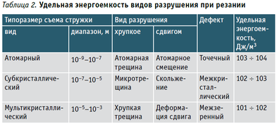Применительно к процессу обработки материала различают пластическое разрушение, которое происходит при пластической деформации по всему объему тела (обработка давлением), и хрупкое разрушение (обработка резанием), которое происходит за счет распространения трещины при пластической деформации, происходящей в малой области. Рассматривая с энергетической точки зрения приведенные выше три уровня процесса разрушения, в табл. 2 приведены диапазоны значений удельной энергии, необходимой для выполнения собственно физического процесса резания пластической деформации материала, характер которой определяется физическим явлением, обусловливающим этот процесс (трещина, смещение, сдвиг) в соответствии с величиной снимаемого материала.